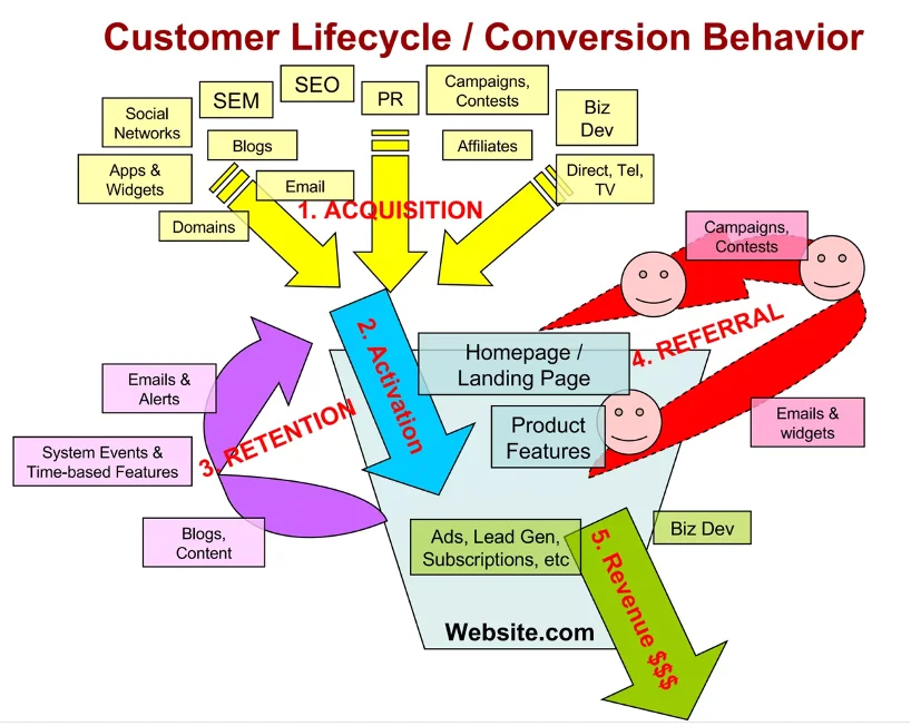 500Startups라는 유명한 스타트업 액셀러레이터 및 벤처캐피탈 펀드의 창립자 중 한 명으로 널리 인정 받고 있는 Dave McClure는 2007년 Ignite Seattle 이벤트에서 처음으로 AARRR 프레임워크, 즉 "Startup Metrics for Pirates"를 소개했습니다. 이 프레임워크는 고객 생명주기의 다섯 가지 핵심 단계인 Acquisition(획득), Activation(활성화), Retention(유지), Referral(추천), 그리고 Revenue(수익)을 중심으로 하며, 특히 제품 중심의 스타트업들이 지속 가능한 성장을 위해 집중해야 할 지표들을 다룹니다.