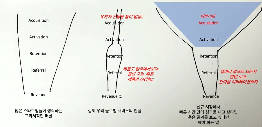 하지만 대부분의 스타트업들은 한국에서도 헐떡 거리는데, 글로벌에서 언제까지나 진득하게 앉아서 세월아, 네월아 제품을 고도화하고 있을 수만은 없습니다. 우리 제품의 핵심 기능만 린하게 복사 붙여 넣기 해놓고, 해외의 유저들이 우리 제품의 핵심 기능을 어떻게 생각하는지를 빠르게 본 다음, 그것을 기반으로 제품을 단계별로 고도화해나가고, 극단적인 경우에는 그 국가에서는 빨리 접어 버리는 게 상책일 수도 있습니다. 즉, 결국 첫 퍼널에 얼마나 많은 리드가 퍼부어지는지가 핵심입니다.