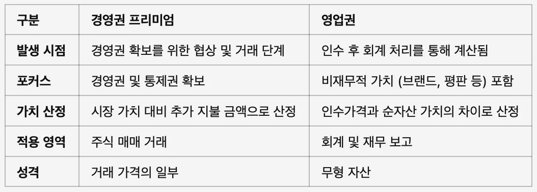 경영권 프리미엄은 영업권과는 달리 기업고유의 가치라기보다 기업의 경영권의 거래에 있어 매수에 따른 시너지 효과를 내는 가치라는 설명에 더 가깝습니다. 또 학문적으로도 명확히 정립되지 못한 개념입니다.