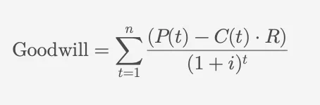 정상 이익률을 초과하는 이익의 가치를 가지고 있는 것이 영업권이기 때문에 초과이익금액을 계산합니다. 초과이익이 n년동안 지속된다는 전제로 예상순이익 (P(t))에서 순자산(C(t ))에 정상이익률(R)을 곱한 것을 뺍니다. 그리고 이것을 초과이익환원율((1+r)^t)로 나눠 현재의 가치로 환산합니다.