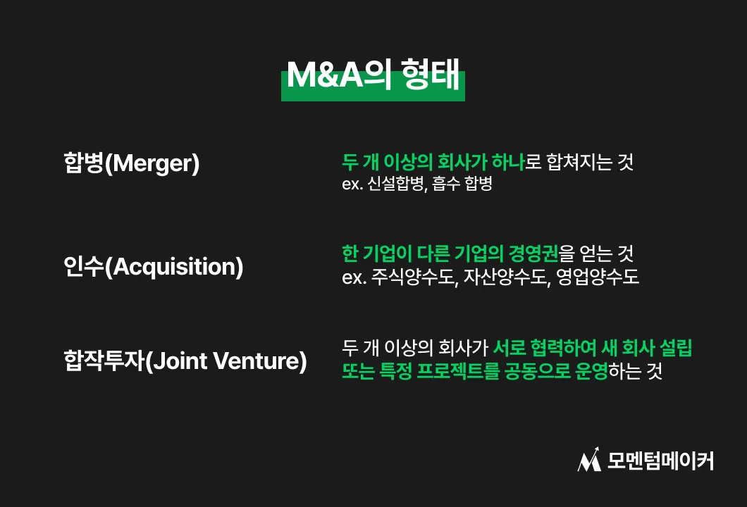 M&A의 형태는 크게 5가지로 나눌 수 있어요. 1) 합병(Merger), 2) 주식양수도(Stock Purchase), 3) 자산양수도(Asset Purchase), 4) 영업양수도(Business Transfer), 5) 합작투자(Joint Venture)인데요. 살펴보시죠.